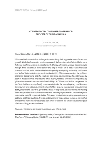 Majumdar, Arjya B. (2020) Convergence In corporate governance: The case of China and India. BRICS Law Journal, 7 (1). pp. 59-90. ISSN 24099058