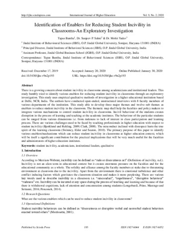 integrate various mechanisms to control student incivility in classrooms. Incivil behaviour of the students creates disruption in the process of learning and teaching at the academic institutes. The behaviour of the particular students can be ranged from various dimensions i.e. from rudeness to lack of interest in class participation and learning process. There are various challenges used to be faced by teaching professionals in higher education with respect to student incivility (Bjorklund and Rehling, 2009; Clark, 2008). The misconduct inclined with disrespect hurts the true spirit of the learning classroom (Swinney, Elder and Seaton, 2010). The primary purpose of this paper to identify various enablers/mechanisms which can reduce student incivility in classrooms at higher education context, which will be itself a significant contribution for the practical implications that will be very much useful for the faculties and administrators of higher education institutes.