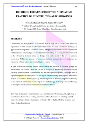 Shah, Maharshi and Shrotriya, Aadhya (2020) Decoding the nuances of the normative practice of constitutional borrowings. Commonwealth Law Review Journal │, 6. pp. 391-405. ISSN 25813382