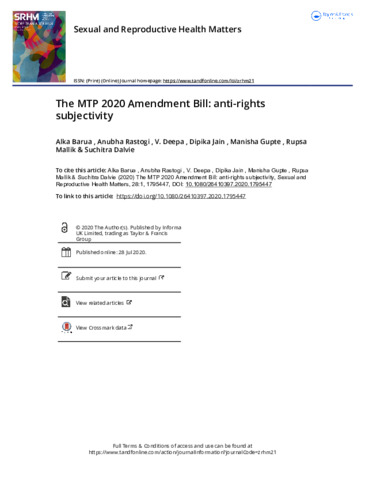 Barua, Alka, Rastogi, Anubha, Deepa, V, Jain, Dipika, Gupta, Manisha, Malik, Rupsa and Dalvie, Suchitra (2020) The MTP 2020 amendment bill: Anti-rights subjectivity. Sexual and Reproductive Health Matters, 28 (1): 1795447. ISSN 26410397