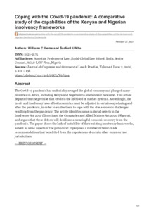 Iheme, Williams C. and Mba, Sanford U. (2020) Coping with the Covid-19 pandemic: A comparative study of the capabilities of the Kenyan and Nigerian insolvency frameworks. Journal of Corporate and Commercial Law & Practice,, 6 (2). ISSN 2521-2575