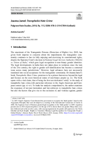 The enactment of the Transgender Persons (Protection of Rights) Act, 2019, has given fresh impetus to concerns about the impediments the transgender community continues to face in fully enjoying and exercising its constitutional rights, despite the Supreme Court’s decision in National Legal Services Authority (NALSA) vs. Union of India,Footnote1 which gave legal recognition to non-binary gender identities. The legal developments in India have not taken place in isolation; since the turn of the 21st century, the right to gender self-identification has become a contested issue across many jurisdictions.Footnote2 However, legal advances have not necessarily translated into social acceptance for the transgender community. Dr Joanna Jamel’s book, Transphobic Hate Crime, promises to be a primer that moves beyond the legal and focuses on the socio-historical status of non-binary people (p. xi). The book opens with a vital claim, that of being the first text dedicated ‘solely’ to the study of transphobic hate crime,with particular reference to the Anglo-American and European context (pp. xi–xv). To make her analysis comprehensive, the author examines the responses of not just lawmakers and law-enforcers to transphobic hate crimes but also the factors that give rise to the exclusion of, and violence against, gender non-conforming people. Despite the forthright admission of her limited frame of reference, the author attempts to address carping criticism of the ‘whiteness’ of research on sexual orientation, gender identity and expression, and sexual characteristics (SOGIESC) (p. xi). To this end, she endeavours to deconstruct the fallacious belief of the homogeneity of the transgender community, emphasising the advantages of adopting an intersectional approach to scholarship on the various axes of identity (p. xv). In this review, I assess if the book manages to accomplish its ambitious goal of providing a ‘holistic perspective’ on the rights of trans individuals (p. xi).
