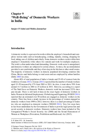 Sahni, Sanjeev P. and Junnarkar, Mohita (2019) ‘Well-Being’ of domestic workers in India. In: Recognition of the Rights of Domestic Workers in India : Challenges and the Way Forward. Springer, Singapore, pp. 163-175. ISBN 9789811357640