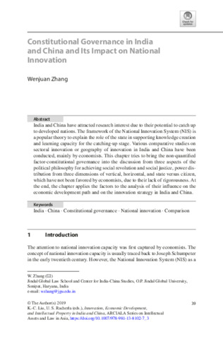 Zhang, Wenjuan (2019) Constitutional governance in India and China and its impact on national innovation. In: Constitutional governance in India and China and its impact on national innovation. ARCIALA Series on Intellectual Assets and Law in Asia . Springer, Singapore, pp. 39-67. ISBN 9789811381010