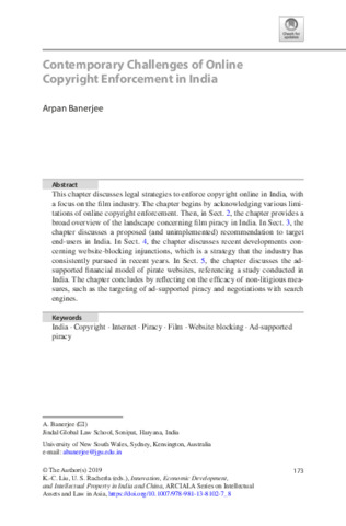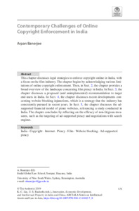 Banerjee, Arpan (2019) Contemporary challenges of online copyright enforcement in India. In: Contemporary challenges of online copyright enforcement in India. ARCIALA Series on Intellectual Assets and Law in Asia . Springer, Singapore, pp. 173-191. ISBN 9789811381010
