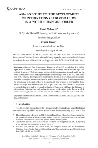 Mahaseth, Harsh and Bansal, Ayushi (2022) Asia and the ICC: The development of international criminal law in a world changing order. International and Comparative Law Review, 21 (2). pp. 162-186. ISSN 24646601