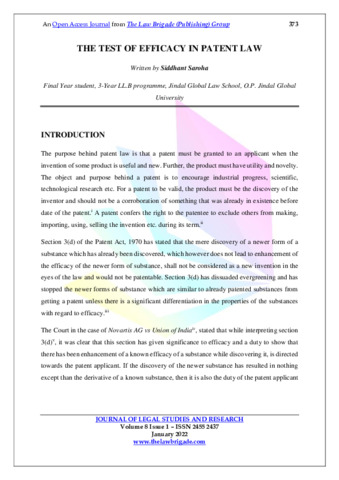Saroha, Siddhant (2022) The test of efficacy in patent law. Journal of Legal Studies and Research, 8 (1). pp. 373-376. ISSN 24552437