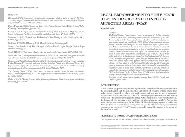 Singh, Naresh (2022) Legal empowerment of the poor (LEP) in fragile and conflict-affected areas (FCAS). Jindal Journal of Public Policy, 6 (1). pp. 16-27. ISSN 2277-8743