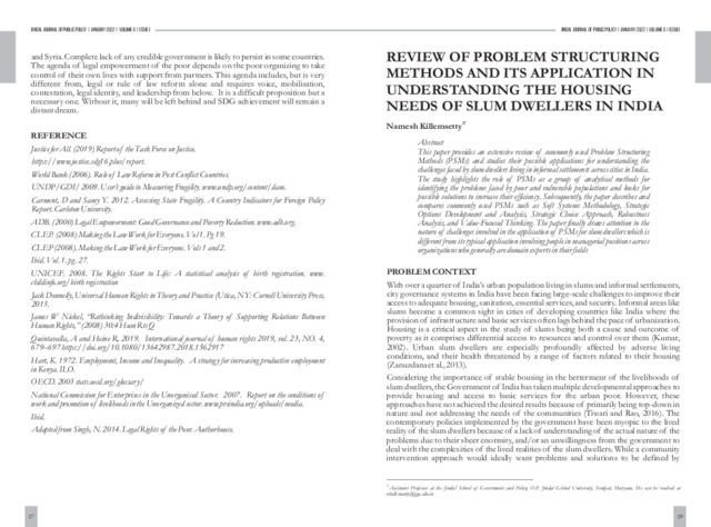 Killemsetty, Namesh (2022) Review of problem structuring methods and its application in understanding the housing needs of slum dwellers In India. Jindal School of Government and Public Policy, 6 (1). pp. 28-44. ISSN 2277-8743