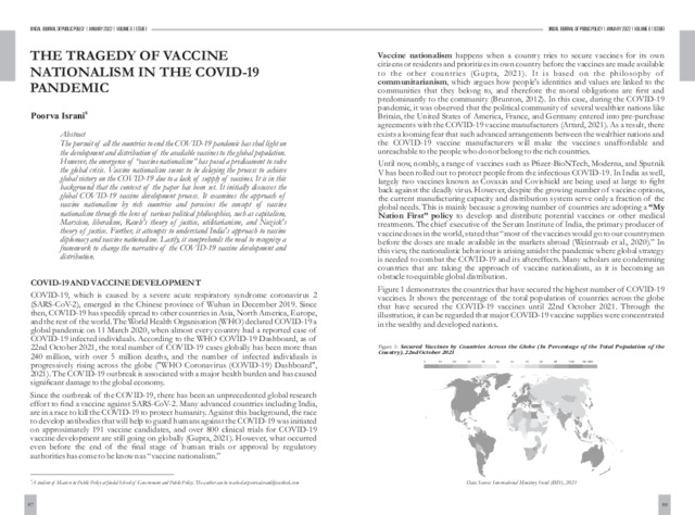 The pursuit of all the countries to end the COVID-19 pandemic has shed light on the development and distribution of the available vaccines to the global population. However, the emergence of “vaccine nationalism” has posed a predicament to solve the global crisis. Vaccine nationalism seems to be delaying the process to achieve global victory on the COVID-19 due to a lack of supply of vaccines. It is in this background that the context of the paper has been set. It initially discusses the global COVID-19 vaccine development process. It examines the approach of vaccine nationalism by rich countries and perceives the concept of vaccine nationalism through the lens of various political philosophies, such as capitalism, Marxism, liberalism, Rawls's theory of justice, utilitarianism, and Nozick's theory of justice. Further, it attempts to understand India's approach to vaccine diplomacy and vaccine nationalism. Lastly, it comprehends the need to recognize a framework to change the narrative of the COVID-19 vaccine development and distribution.