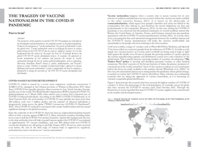 Israni, Poorva (2022) The tragedy of vaccine nationalism in the covid-19 pandemic. Jindal Journal of Public Policy, 6 (1). pp. 87-98. ISSN 2277-8743