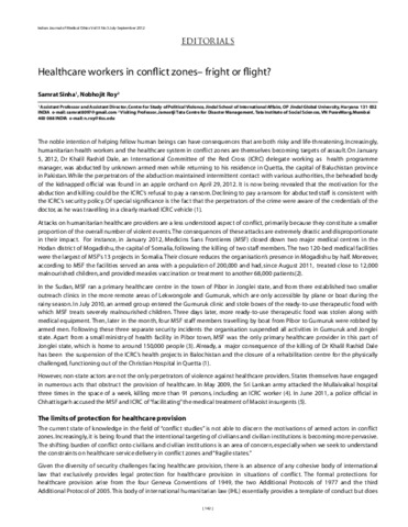 Sinha, Samrat (2012) Healthcare workers in conflict zones – fright or flight? Indian Journal of Medical Ethics, 9 (3). pp. 142-144. ISSN 09748466