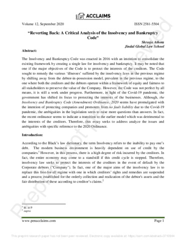 Athota, Shreeja (2021) Reverting back: a critical analysis of the insolvency and bankruptcy code. Pen Acclaims, 12 (2020). ISSN 25815504