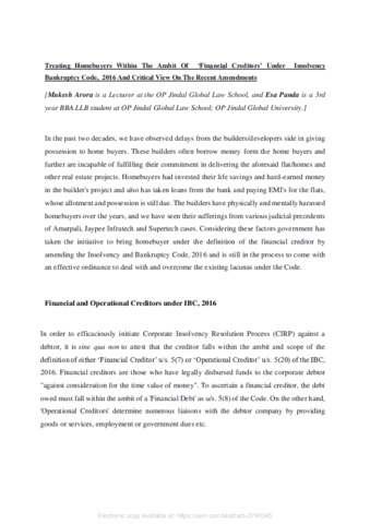 Arora, Mukesh and Panda, Esa (2021) Treating homebuyers within the ambit df ‘financial creditors’ under insolvency bankruptcy code, 2016 and critical view on the recent amendments. [Preprint] (In Press)