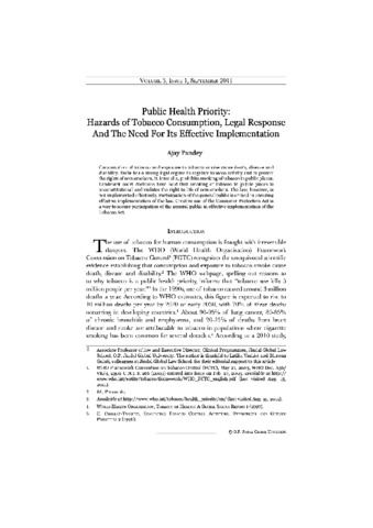 Pandey, Ajay (2011) Public health priority: Hazards of tobacco consumption, legal response and the need for its effective implementation. Jindal Global Law Review, 3 (1). pp. 61-86. ISSN 0975-2498