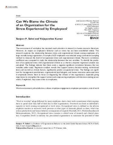 Sahni, Sanjeev P. and Kumar, Vaijayanthee (2012) Can we blame the climate of an organization for the stress experienced by employees? Jindal Journal of Business Research, 1 (2): 2012. pp. 181-192. ISSN 23210311