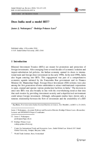 Nedumpara, James J. and Lazo, Rodrigo Polanco (2016) Does India need a model BIT? Jindal Global Law Review, 7 (2). pp. 117-125. ISSN 0975-2498