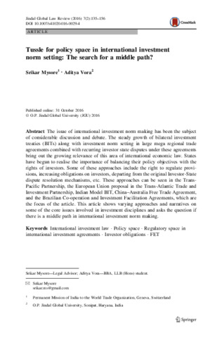Mysore, Srikar and Viral, Aditya Vora (2016) Tussle for policy space in international investment norm setting: The search for a middle path? Jindal Global Law Review, 7 (2). pp. 135-156. ISSN 0975-2498