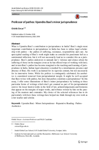 Sircar, Oishik (2018) Professor of pathos: Upendra Baxi’s minor jurisprudence. Jindal Global Law Review, 9 (2). pp. 203-222. ISSN 0975-2498