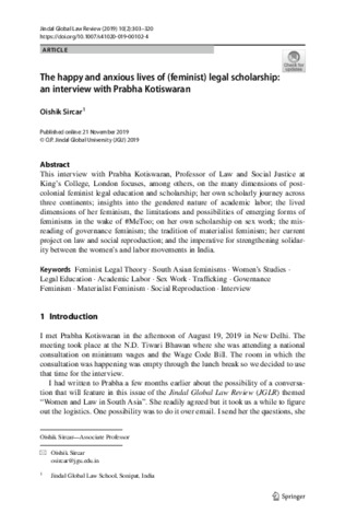 Sircar, Oishik (2019) The happy and anxious lives of (feminist) legal scholarship: an interview with Prabha Kotiswaran. Jindal Global Law Review, 10 (2). pp. 303-320. ISSN 0975-2498