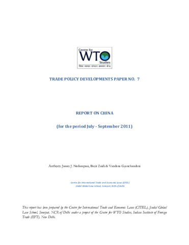 Nedumpara, James J., Zaidi, Basit and Gyanchandani, Vandana (2011) Trade policy development report on China 2011. Project Report. Indian Institute of Foreign Trade (IIFT), New Delhi, New Delhi.
