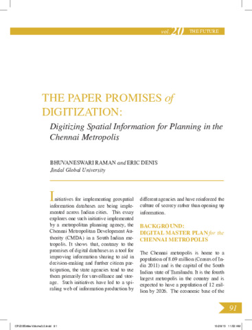 Raman, Bhuvaneswari and Denis, Eric (2013) The Paper promises of digitization: Digitizing spatial information for planning in the Chennai metropolis. Critical Planning: UCLA Urban Planning Journal, 20. pp. 91-96. ISSN 1522-9807