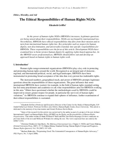 Griffin, Elizabeth Ann (2013) The ethical responsibilities of human rights NGOs. International Journal of Not-for-Profit Law, 15 (2). pp. 5-23. ISSN 1556-5157