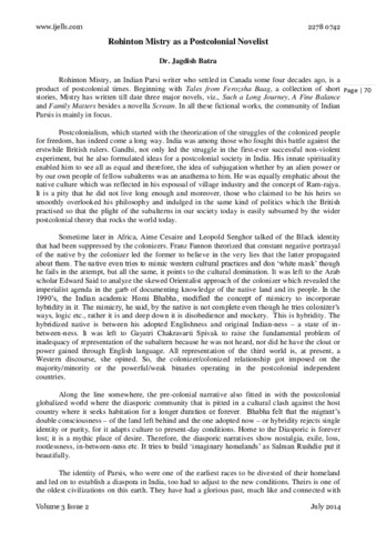 Batra, Jagdish (2014) Rohinton mistry as a postcolonial novelist. International Journal of English Literature, Language and Skills, 3 (2). pp. 70-76. ISSN 2278-0742