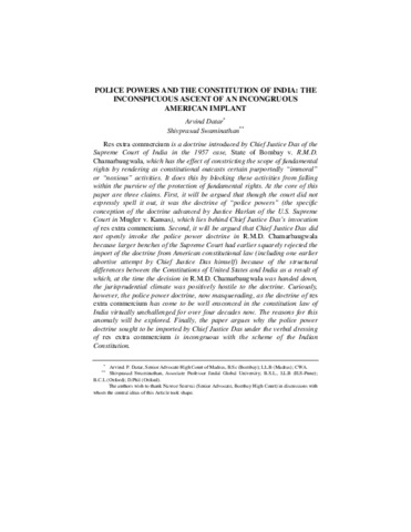 Datar, Arvind and Swaminathan, Shivprasad (2014) Police powers and the Constitution of India: The inconspicuous ascent of an incongruous American implant. Emory International Law Review, 28 (1). pp. 63-121. ISSN 1052-2850