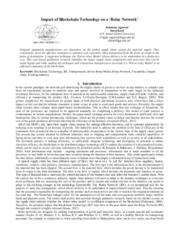 Agarwal, Saksham and Koul, Saroj (2019) Impact of blockchain technology on a ‘relay network’. In: 16th AIMS Int’l Conference on Management (AIMS-16), 3-5, January,2019, Pune.