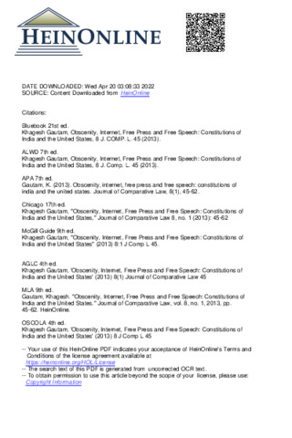 Gautam, Khagesh (2014) Obscenity, internet, free press and free speech: constitutions of India and the United States. Journal of Comparative Law, 8 (1). pp. 45-62. ISSN 14770814