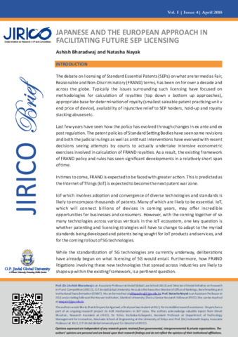 Bharadwaj, Ashish and Nayak, Natasha (2018) Japanese and the European approach in facilitating future SEP licensing. JIRICO Brief, 1 (4). pp. 1-6.