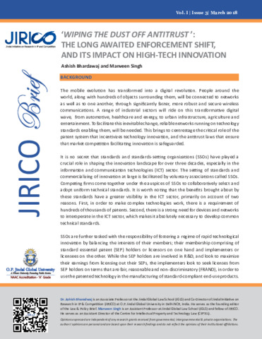 Bharadwaj, Ashish and Singh, Manveen (2018) Wipin the dust off antitrust: The long awaited enforcement shift, and it's impact on high-technology innovation. JIRICO Brief, 1 (3). pp. 1-7.