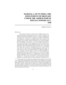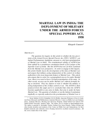 The question for inquiry in this article is whether the key provisions of the Armed Forces Special Powers Act, 1958 (“AFSPA”), an Indian Parliamentary legislation, amount to a de facto proclamation of Martial Law in India. The constitutional validity of AFSPA has been upheld by a unanimous constitution bench of five judges of the Supreme Court of India. But the AFSPA has not yet been examined from the Martial Law perspective. In order to engage in this inquiry, this article briefly traces the development of the idea of Martial Law and argues that military acting independent of the control of civilian authorities is the most important feature of Martial Law. This article also argues that in order for a geographical area to be under Martial Law, there is no need to have a formal promulgation of the same. In other words, an area can be under Martial Law without formally being so declared. They key feature to note is whether the military is acting independent of the civilian control or not. The AFSPA is then analyzed from this angle and it is concluded that when the AFSPA becomes applicable to any area in India, that area is under de facto Martial Law. The question of whether or not the Indian Constitution impliedly or expressly authorizes the proclamation of Martial Law is a natural follow-up question that is left for future examination. However, the Supreme Court’s decision upholding the constitutional validity of the AFSPA is criticized on the ground that the Court should have recognized and called the AFSPA as what it truly is – a legislation authorizing a de facto proclamation of Martial Law in India.