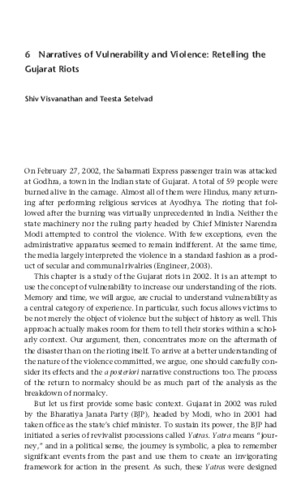 Visvanathan, Shiv and Setelvad, Testa (2014) Narratives of vulnerability and violence: Retelling the Gujarat riots. In: Vulnerability technological cultures new directions in research and governance. MIT Press, London, pp. 109-130. ISBN 9780262525800
