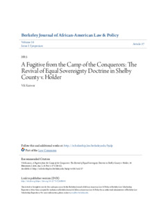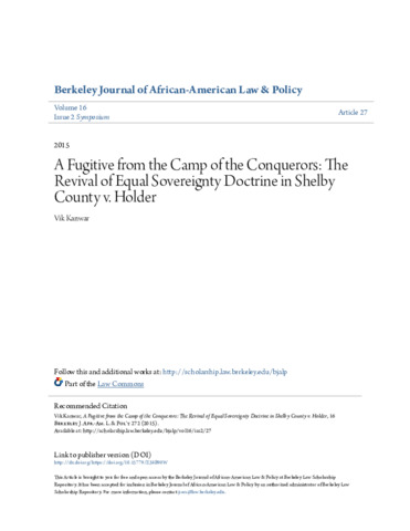 Kanwar, Vik (2014) Fugitive from the camp of the conquerors: the revival of equal sovereignty doctrine in Shelby County V. Holder. Berkeley Journal of African-American Law & Policy, 16 (2): 27. pp. 272-312. ISSN 1086-6620