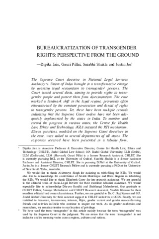 Jain, Dipika, Pillai, Gauri, Shukla, Surabhi and Jos, Justin (2018) Bureaucratization of transgender rights: perspective from the ground. Socio-Legal Review, 14 (1). pp. 99-142. ISSN 09735216