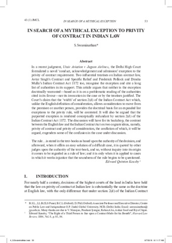 Swaminathan, Shivprasad (2016) In search of a mythical exception to privity in Indian law. Journal of Malaysian and Comparative Law, 43 (01). pp. 53-68.