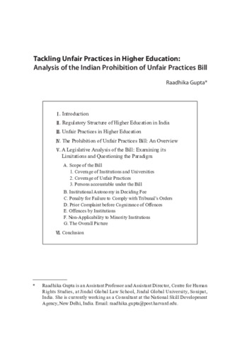 Gupta, Raadhika (2015) Tackling unfair practices in higher education: analysis of the Indian Prohibition of Unfair Practices Bill. KLRI journal of law and legislation, 5 (1). pp. 85-116. ISSN 2234-7526