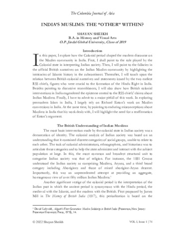Sheikh, Shayan (2022) India's Muslims: The 'other' within? Columbia Journal of Asia, 1 (1). pp. 74-79.
