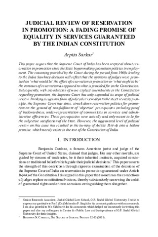 Sarkar, Arpita (2018) Judicial review of reservation in promotion: A fading promise of equality in services guaranteed by the Indian constitution. NUJS Law Review, 11 (2). pp. 213-236. ISSN 0975-0207