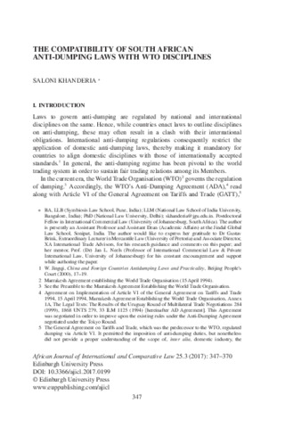 Khanderia, Saloni (2017) The Compatibility of South African anti-dumping laws with WTO disciplines. African Journal of International and Comparative Law, 25 (3). pp. 347-370. ISSN 1755-1609
