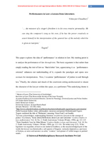 This paper explores the idea of „performance‟ in relation to law. My starting point is to analyse the performance of law through text. The basic argument is that rather than simply reading the text of law as „black-letter‟ law, appreciating it as „performance oriented‟ enhances our understanding of it, expands the paradigm and opens new avenues for interpretation. Next, I examine „performances‟ of justice in and through law. Finally, the scheme and rituals of the courtroom setting arediscoursed to situate the character of the lawyer within this space, as a performer. The underlying theme is to advocate the reading, teaching and understanding of law as a humanities-based discipline which is best appreciated in terms of „performance.‟