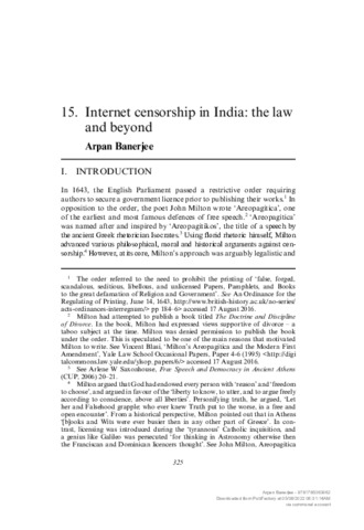The internet has enabled individuals to air opinions in a largely unregulated space. Laws censoring the internet are thus widely opposed in democratic societies. However, censorship is a complex phenomenon. This chapter begins by questioning the notion of censorship as a legally sanctioned prior restraint on speech. The chapter argues that censorship should be viewed in a broader social and political context, and can assume a variety of different forms. With this premise, the chapter refers to the judgment of the Indian Supreme Court in Shreya Singhal v Union of India. The judgment, which saw the Supreme Court strike down a draconian provision of India’s Information Technology Act, has been celebrated in the mainstream media. However, the impact of the judgment may be limited as the concept of internet censorship should be viewed beyond the semantics of legislation. Thus, the harassment of citizens for political speech – which led to the case – could continue through other methods