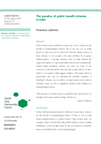 Lakhotia, Shantanu (2017) The paradox of public benefit schemes in India. SADF FOCUS (34). pp. 1-11. ISSN 2406-5633