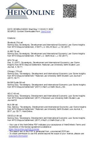 Das, Sannoy (2017) Sovereignty, development and international economic law: some insights from WTO dispute settlement. National Law University Delhi Student Law Journal, 4. pp. 53-71. ISSN 2277-4009