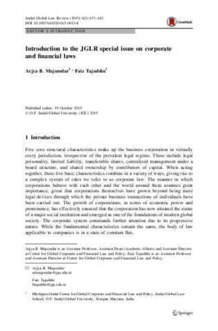 Majumdar, Arjya B. and Tajuddin, Faiz (2015) Introduction to the JGLR special issue on corporate and financial laws. Jindal Global Law Review, 6 (2). pp. 137-142. ISSN 0975-2498