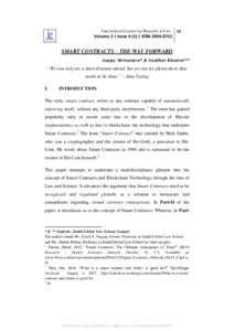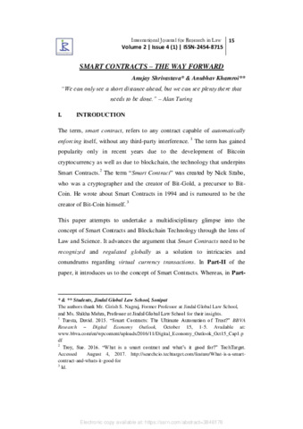 Shrivastava, Anujay and Khamroi, Anubhav (2017) Smart contracts – the way forward. International Journal for Research in Law, 2 (4). pp. 15-36. ISSN 2454-8715