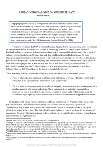 The paper proposes a theory of change in the form of an interactive online course which can be developed by academia and used by business (specifically information technology companies) to promote a meaningful dialogue on human rights (specifically the right to privacy) with different stakeholders in the national context. Indeed, our theory of change aims to promote meaningful dialogue within online community on whether business practises are actually sensitive to their human rights commitments under the UN Business and Human Rights (UN-BHR).