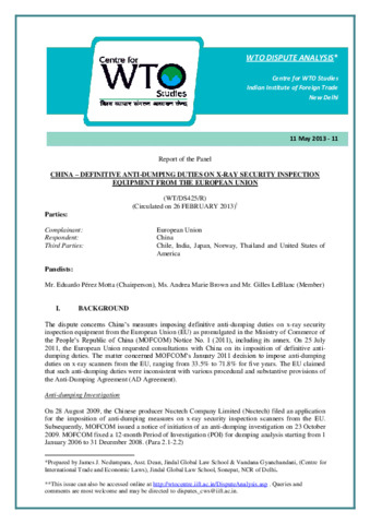 Nedumpara, James J. and Gyanchandani, Vandana (2013) China – definitive anti-dumping duties on X-Ray security inspection equipment from the European Union dispute analysis. Project Report. Indian Institute of Foreign Trade, New Delhi.